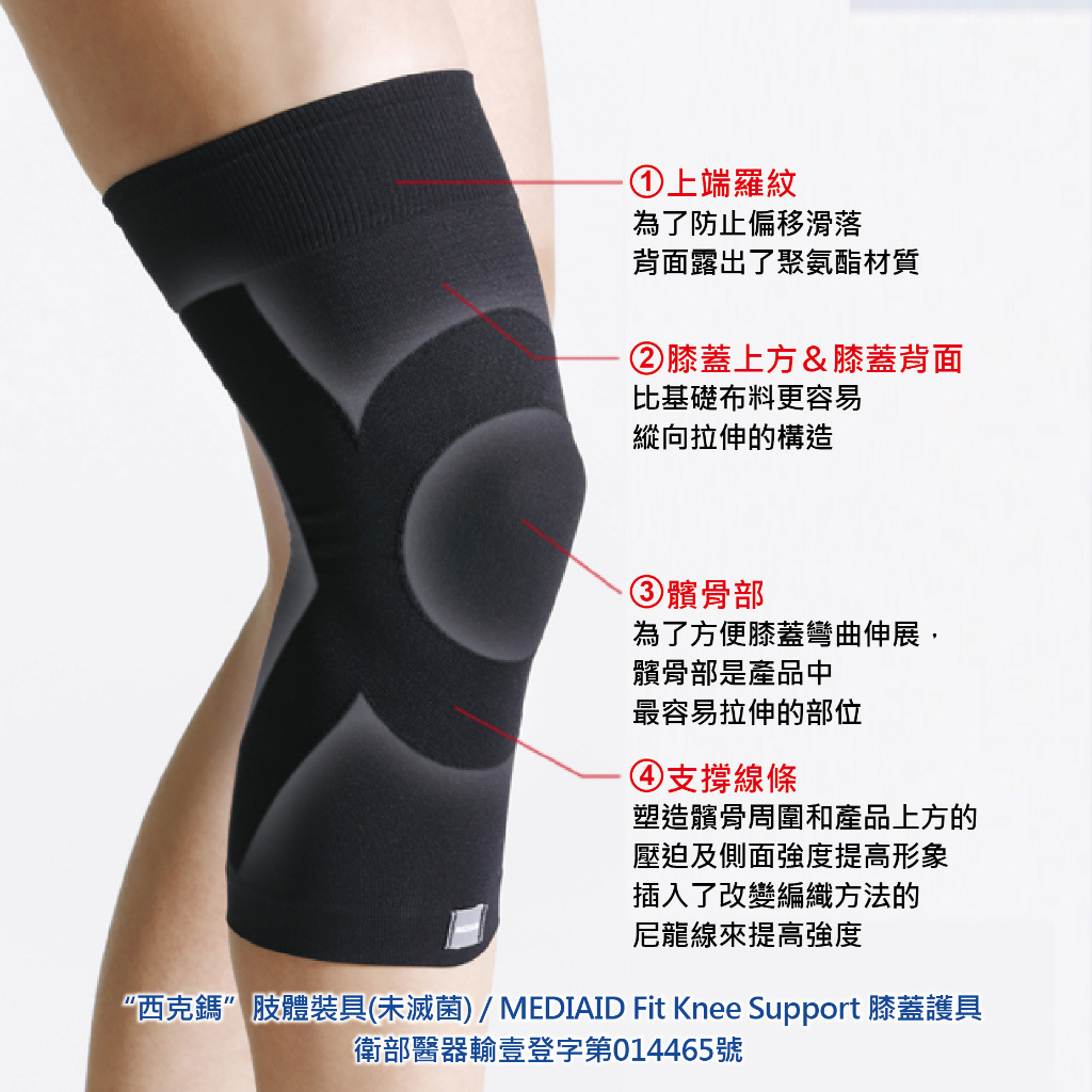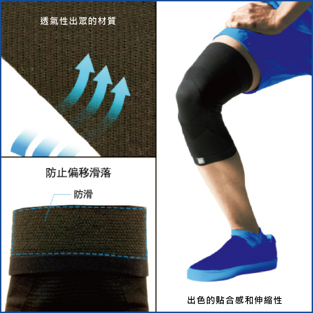 ①採用透氣性極佳的材質,長時間穿戴也不會感到不適。 ②上端內側露出泡棉,藉此防止下滑。 ③膝上方&膝後側的材質比基礎材質具有更佳的縱向延展性,膝蓋部位材質產品當中最佳的延展性,藉此實現彎曲、伸展優異的貼合感。