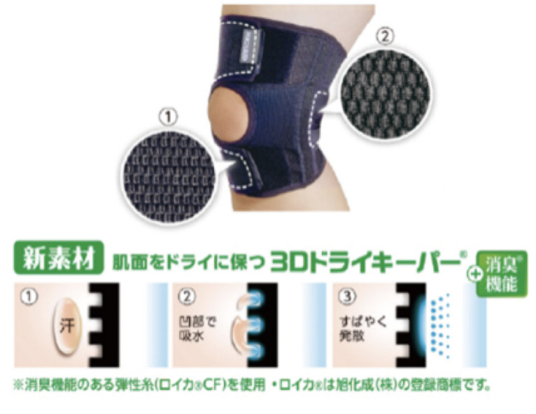 利用具有伸縮力的網布材料和活性樹脂支撐條,穩固支撐膝蓋。運用人體3D測量數據,實現優異的貼合感。